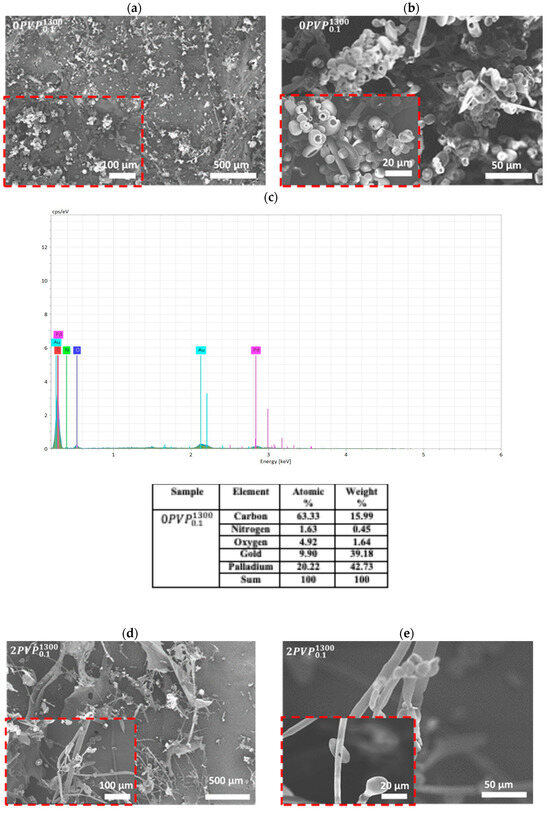 The lyophilized solutions of and were analyzed using Scanning Electron Microscopy (SEM) and Energy-Dispersive X-ray Spectroscopy (EDS). The morphology and elemental composition of the prepared samples are presented in Figure 7. The SEM micrographs with different magnifications (Figure 7a–e) revealed distinct morphological differences between the analyzed samples. Notably, the surface morphology of the pure PVP sample was significantly altered after coordination with Gd(NO3)3. In the case of Gd-doped samples, bead-like structures were observed.