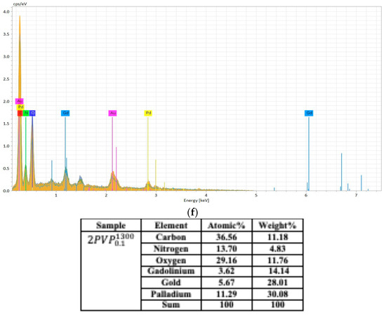 The EDS spectra further confirmed these observations. The spectrum of the sample (Figure 7c) showed peaks corresponding exclusively to carbon (C), nitrogen (N), and oxygen (O) atoms. In contrast, the EDS-SEM microanalysis of the sample qualitatively confirmed the presence of Gd, as indicated by two characteristic peaks in Figure 7f. The spectrum of contains C and O signals at the same positions as in the pure PVP but with reduced intensities.