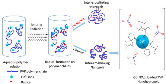 Scheme of radiation-induced synthesis of Gd-loaded PVP nano- and microhydrogels.