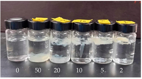 In contrast, incorporating Gd into the PVP solutions resulted in noticeable phase separation following irradiation, as illustrated in Figure 10. The presence of Gd disrupts the homogeneous distribution of the polymer, forming distinct phases or aggregates within the solution. This phase separation suggests that the Gd ions significantly alter the crosslinking behavior or interaction dynamics of the PVP chains during the irradiation process. The phase separation phenomenon was also observed in PVP solutions with a lower molecular weight of 360 kDa. This suggests that the Gd-induced phase separation is not solely dependent on the molecular weight of the polymer but instead on the interaction between Gd and the polymer chains. These findings suggest that for a high PVP concentration, the interactions of Gd ions with the polymer chains disrupt the homogeneous crosslinking network, leading to the formation of larger aggregates and subsequent phase separation.