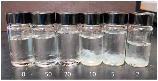 A photograph of PVP (1300 kDa, 0.1 wt%) solutions after EB irradiation in the presence of Gd with R varying from 50 to 2.