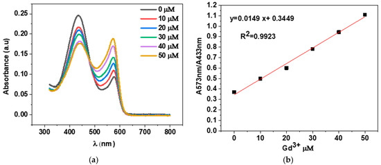 Spectrophotometric determination of free Gd ions by xylenol orange: (a) UV-vis spectrum of xylenol orange in acetate in the presence of varied concentrations of Gd from 0 to 50 µm; (b) calibration curve obtained for absorbance ratio A573/A433 versus Gd3+ concentration.