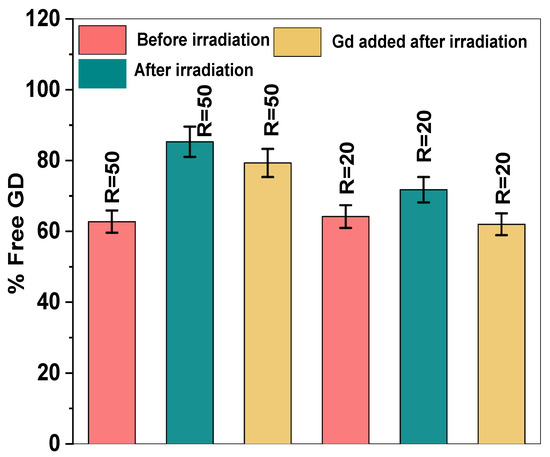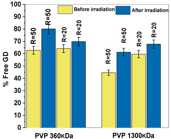 Figure 13 shows the percentage of free Gd in PVP (1300 kDa, 360 kDa) solutions before and after irradiation for two ratios, R = 50 and R = 20.