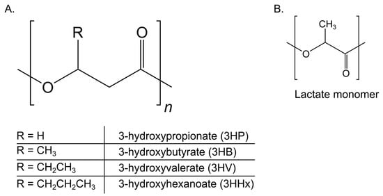 Chemical structure of polyhydroxyalkanoates (PHAs) and common monomers. (A) General PHA backbone with variable R-groups corresponding to key monomers: 3-hydroxypropionate (3HP), 3-hydroxybutyrate (3HB), 3-hydroxyvalerate (3HV), and 3-hydroxyhexanoate (3HHx). (B) Structure of the lactate (LA) monomer, found in poly(3-hydroxybutyrate-co-lactate) (P(3HB-co-LA)) copolymers. These monomers contribute to the physicochemical diversity of PHA-based biopolymers.