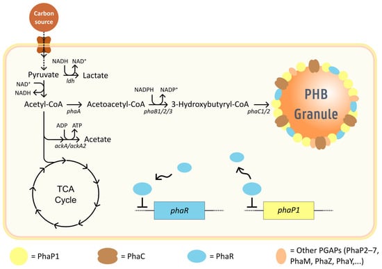 Aside from PHA synthase, additional proteins are associated with the surface of the granular PHB structures that aid in PHB homeostasis and the granule’s formation and stabilization (Figure 2). Alongside PhaC, these gene products are referred to as PHB granule-associated proteins (PGAPs) and include regulator proteins (PhaR), phasins (PhaP1–7) that aid in the formation and stabilization of the nascent polymer granules, PHB depolymerases and oligomer hydrolases (PhaZ/Ys), which play a role in PHB homeostasis by mobilizing stored carbon from the granules, making it accessible for cell growth and maintenance, and a sixth type of PGAP called PhaM that plays a role in localization and is responsible for granule distribution during cell division [62,63,64,65,66]. While these proteins are not involved in direct conversions of precursor molecules into PHB, knowledge of their unique roles and importance in PHB homeostasis is essential for identifying possible targets of metabolic engineering strategies regarding PHB production.