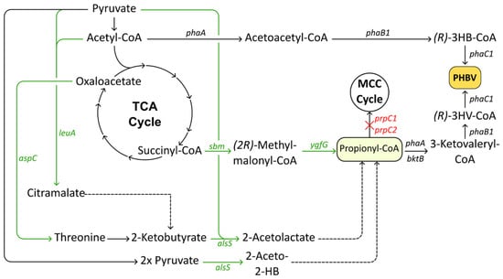 Metabolic pathways used in C. necator to synthesize PHBV from natively produced propionyl-CoA. Black arrows indicate native enzymatic reactions, heterologously expressed enzymes are indicated with green arrows, deletions are indicated in red and marked with ‘X’. Abbreviations: TCA cycle, tricarboxylic acid cycle; PHBV, poly(3-hydroxybutyrate-co-3-hydroxyvalerate); MCC cycle, methylcitric acid cycle; (R)-3HB-CoA, (R)-3-hydroxybutyryl-CoA; (R)-3HV-CoA, (R)-3-hydroxyvaleryl-CoA.