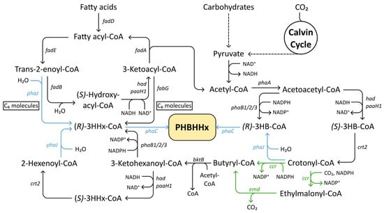 Metabolic pathways involved in PHBHHx biosynthesis. Once fatty acids have been broken down into C6-carbon molecules, they can enter the 3HHx pathway. Black arrows indicate native enzymatic reactions, heterologously expressed enzymes are indicated with green arrows, and genes for which both heterologous and native variants have been used are depicted with blue arrows. Abbreviations: PHBHHx, poly(3-hydroxybutyrate-co-3-hydroxyhexanoate); (S/R)-3HHx-CoA, (S/R)-3-hydroxyhexanoyl-CoA; (S/R)-3HB-CoA, (S/R)-3-hydroxybutyryl-CoA.