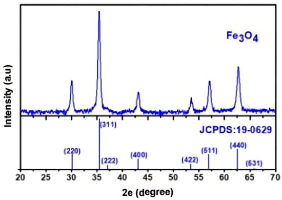 As is known, iron oxides exist in different crystalline phases, such as magnetite (Fe3O4), maghemite (γ-Fe3O4), and hematite (α-Fe3O4), magnetite being the most widespread type [24] with the highest magnetism of all iron oxides. Maghemite, on the other hand, is a mixture of the composition and structure of magnetite and hematite, reflecting structural similarities of both forms of iron oxides. γ-Fe3O4 is a reddish-brown material that forms on soil due to the corrosion of magnetite, and α-Fe3O4 is the oldest known form of iron oxide [25].