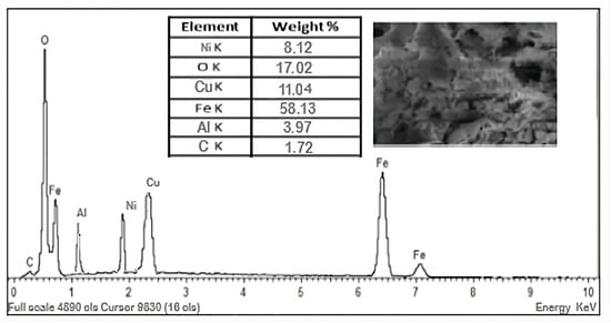 EDX analysis of these nanopowders indicates the presence of oxygen, iron, nickel, copper, and aluminum (Figure 5). Additionally, the presence of a minor peak for carbon (C) was observed in the EDX spectrum.