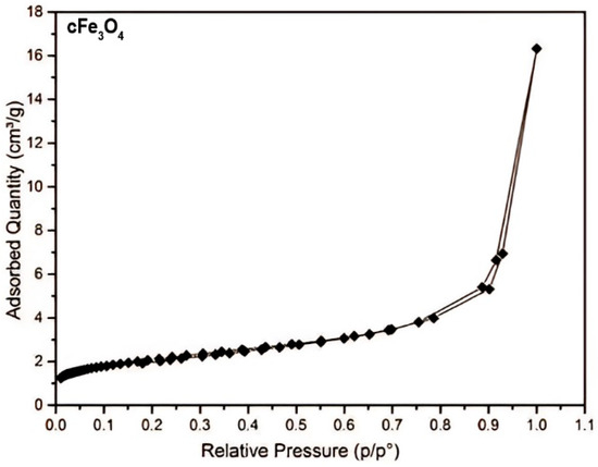 The hysteresis loop is characteristic of ordered mesoporous solids with a stable pore geometry, and the steep configuration suggests that the Fe3O4 polymeric film structure has a narrow pore size distribution—the Barrett–Joyner–Halenda (BJH) model—which, according to the literature [55], increases their relative filling pressure (Figure 1).