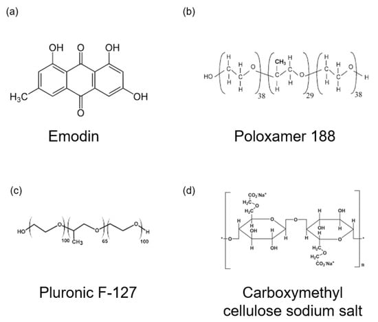 For preparation of the thermoresponsive hydrogels, emodin powder was dissolved in distilled water. To modify the properties of the hydrogel, we added 1 g of poloxamer 188 (Sigma-Aldrich, St. Louis, MO, USA; average molecular weight ~8400 Da) to adjust the gelation temperature and 0.4 g of carboxymethylcellulose sodium salt (Sigma-Aldrich; low viscosity grade, Mw ~90,000 Da) to control viscosity. The mixture was stirred at room temperature for 4 h using a magnetic stirrer. Subsequently, 8 g of pluronic® F-127 (Sigma-Aldrich; average Mw ~12,600 Da) and varying amounts of emodin were added to final emodin concentration of 8 mg/mL for E1 and 15.9 mg/mL for E2. The solution was stirred for 24 h at 4 °C to achieve homogeneity. The hydrogel compositions are listed in Table 2 and the chemical structures of the gel formulation are presented in Figure 1.