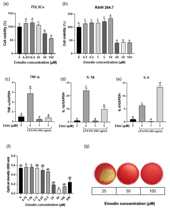 Biological effects of emodin. (a,b) Effect of emodin on the viability of periodontal ligament stem cells (PDLSCs) and RAW 264.7 cells. (c–e) Anti-inflammatory effects of emodin against lipopolysaccharide derived from Porphyromonas gingivalis (LPS-PG) on RAW 264.7 cells; 500 ng/mL of LPS-PG significantly increases mRNA expression of proinflammatory cytokines, while 1 μM of emodin significantly decreases mRNA expression of proinflammatory cytokines (p < 0.05). (f,g) The minimal inhibitory concentration and minimal bactericidal concentration of emodin against P. gingivalis are both 50 μM. Different lowercase letters indicate significant differences among groups.