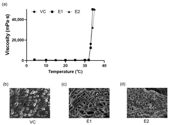 Characteristics of the thermoresponsive hydrogels with or without emodin. (a) Viscosities of the thermoresponsive hydrogels according to temperature. (b–d) Scanning electron microscopy (SEM) images of the thermoresponsive hydrogels. VC: vehicle control without emodin; E1 and E2: emodin-loaded hydrogels with emodin concentrations of 8 and 15.9 mg/mL, respectively.