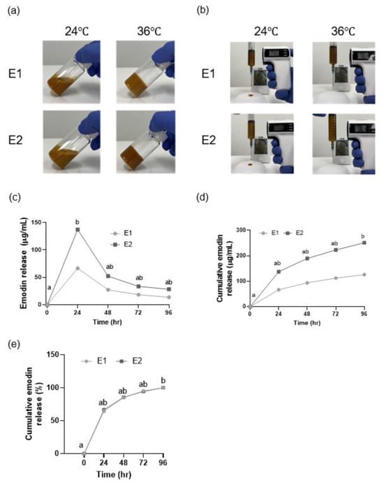 Both the E1 and E2 gels exhibited an initial burst release of 64% within the first 24 h. The emodin release rates for E1 and E2 at 96 h were significantly different from those at 0 h (p < 0.05; Figure 4c–e).