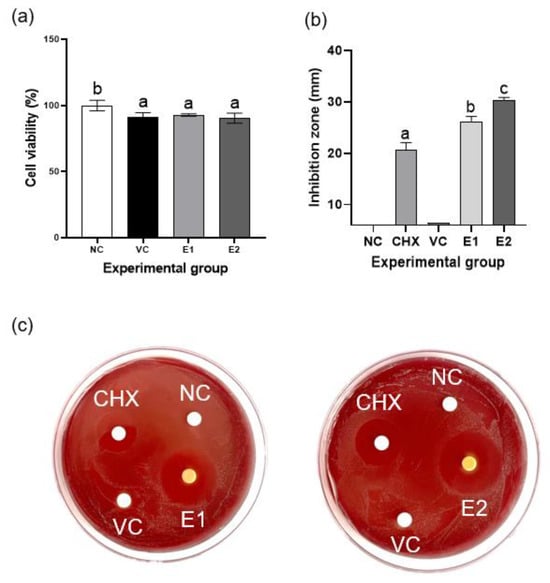 The negative control and VC exhibited no antibacterial activity, whereas the E1 and E2 hydrogels displayed significantly higher antibacterial activity than did CHX, 0.12% chlorhexidine (p < 0.05); this indicated effective inhibition of the growth of P. gingivalis (Figure 5b–c).