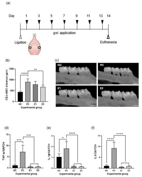 A total of 24 male Sprague–Dawley rats (Samtako, Osan, Republic of Korea) aged 7 weeks and weighing 180–220 g were used for the study. The animals were divided into four groups randomly, with six rats per group: NC, without ligature or treatment; PC, ligature without treatment; E1, ligature with E1 gel treatment; E2, ligature with E2 gel treatment. S.H.-M. was aware of the group allocation. The rats were housed in a controlled environment with a room temperature of (23 ± 2) °C and a 12 h light–dark cycle with access to food and water ad libitum. The body weights of the animals were measured every 2 days, and their bedding was replaced every 3–4 days. All animal experiments were approved by the Institutional Animal Care and Use Committee of Wonkwang University (approval no. WKU 21-95) and performed in compliance with the ARRIVE guidelines for animal research. The sample size was calculated using G*Power software version 3.1.9.7 with an effect size of 0.80.