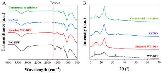 (A) FT-IR spectra and (B) XRD spectra of the raw WC-DFF, bleached WC-DFF, and CCNC samples in comparison with commercial microcrystalline cellulose.