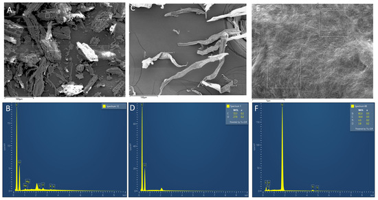 FE-SEM image and its corresponding EDS of (A,B) the raw WC-DFF, of (C,D) the bleached WC-DFF, and of the CCNCs (E,F). The table inset showed the element ratio.
