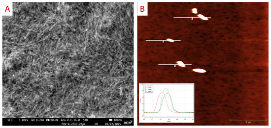 (A) SEM image of the CCNC sample deposited on SiO2 (100) substrate coated with 20 nm of Ti layer. (B) AFM topography of the CCNC sample deposited on mica substrate obtained by contact mode, with the inset showing the height profile of the CCNC particles 1, 2, and 3.