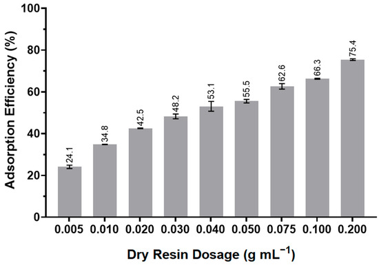A solution with a concentration of 2.5 g L−1 of the arabinoxylan extract was prepared, and different dry resin dosages were added to evaluate the effect of the resin dosage. The adsorption efficiency after 24 h with orbital stirring is presented as a function of the dry resin dosage in Figure 1.