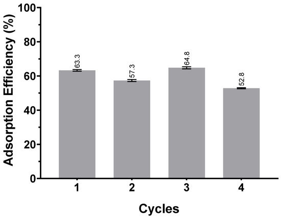 Adsorption efficiency (E%) after each adsorption/desorption cycle. The error bars indicate the standard deviation of the means, n = 3.