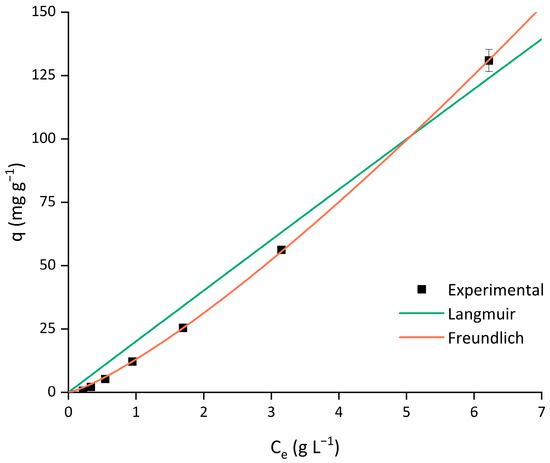 The Langmuir model describes monolayer adsorption, assuming that only one molecule occupies each adsorption site; therefore, the adsorption is proportional to the number of sites already occupied. In contrast, the Freundlich model is based on multilayer adsorption, where adsorption occurs on heterogeneous surfaces, meaning that the binding sites and the adsorbates do not have homogeneous affinity [29].
