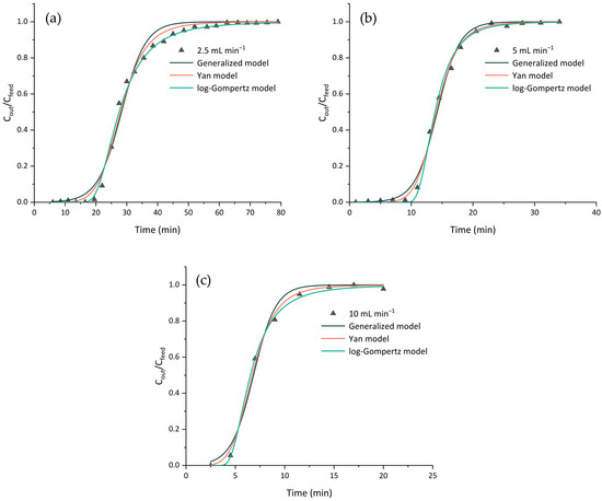 Experimental (symbols) and predicted (full lines) breakthrough curves obtained using the Yan, log-Gompertz and generalized logistic models at flow rates of (a) 2.5, (b) 5 and (c) 10 mL min−1. The reported values are from a single experiment (n = 1).