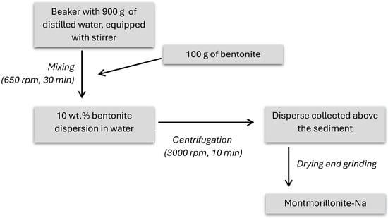To the 2000 cm3 beaker containing 900 g of distilled water, 100 g of bentonite was added and stirred for 30 min to create a homogeneous mixture. Subsequently, 10 wt% aqueous dispersion of bentonite was centrifuged (Sigma 6K15 centrifuge, Osterode am Harz, Germany) for 10 min at 3000 rpm. The purified MMT dispersion above the sludge was removed, dried, and ground. Figure 2 presents the scheme of montmorillonite isolation from the bentonite source [36].