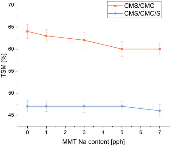 Generally, with an increase in montmorillonite content, the solubility in water decreased. However, for CMS/CMC two-component films, the decrease was more significant and almost linear, dropping from 64% to 60% for an MMT-Na content of 5 pph and higher. Such an effect was also reported for CMS/CMC/S three-component systems [20,44]. In the case of anionic biopolymers, the drop in the TSM value can be caused by the interaction between the OH groups of the clay platelets and the carbonyl groups of polymer chains [45] forming a more “packed” 3D structure. Moreover, highly hydrophilic carboxymethyl polysaccharidic chains and starch can intercalate into the MMT gallery [20,46], being trapped in the composite and leading to reduced interaction with water.