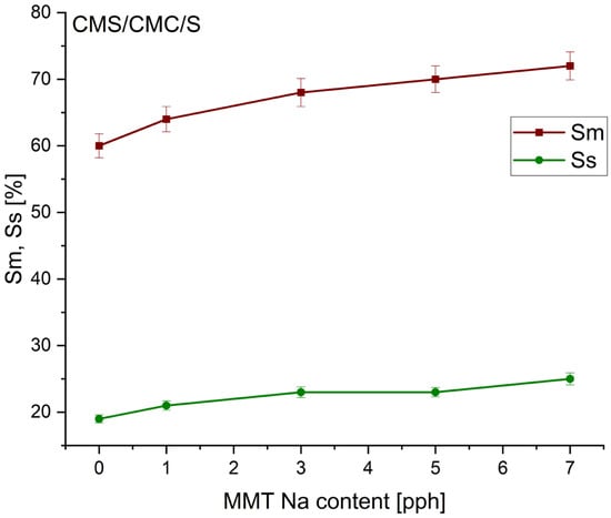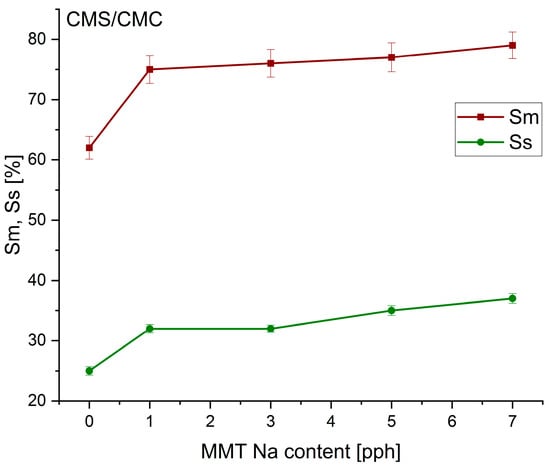 With an increase in MMT-Na content, the swelling in water significantly increased (about 20% for CMS/CMC with 7 pph MMT, and 10% for CMS/CMC/S with 7 pph MMT). The surface swelling ratio also increased with the filler content increase. This could be a result of hydrogen bonding between molecules, forming a large framework that is able to collect water [47]. Intercalated polymer chains unfold after water sorption, increasing the framework’s density and Sm and Ss without increasing the material’s solubility (Figure 4 and Figure 5). The swelling parameters are lower for CMS/CMC/S than for CMS/CMC films.