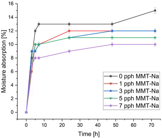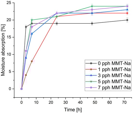 The moisture absorption of the prepared biofilms is presented in Figure 6 and Figure 7. The moisture absorption exhibits a similar trend, characterized by a rapid initial rise and subsequent stabilization within a few hours. The stabilization of CMS/CMC systems occurred after ca. 24 h, and for films containing starch, it occurred after ca. 10 h. Additionally, the latter absorbed less moisture than CMS/CMC films.