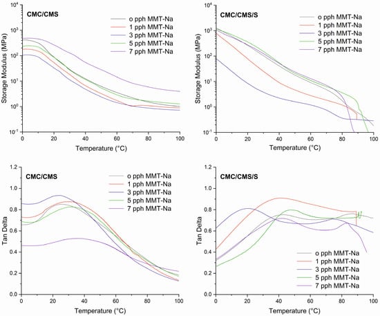 DMTA results (storage moduli and tanδ curves) for CMC/CMS and CMC/CMS/S films with different amounts of sodium montmorillonite (MMT-Na).