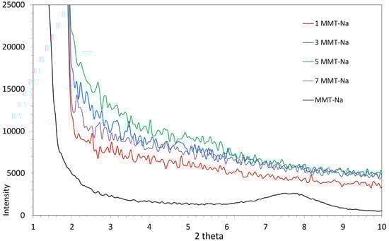 The degree of montmorillonite dispersion in the modified polysaccharide matrix was investigated with X-ray diffraction analysis. In Figure 9, the sample XRD patterns of the CMC/CMC/S biocomposite with various concentrations of MMT-Na are shown, together with the pristine MMT-Na filler pattern. The clay exhibited a single diffraction peak at 7.8 ° (nm) corresponding to the aluminosilicate platelets’ gallery. In the composite biofilms, this peak flattened, indicating the exfoliation of the filler into the polysaccharidic matrix, independent of the filler content. Similar results were obtained in our previous studies [46].