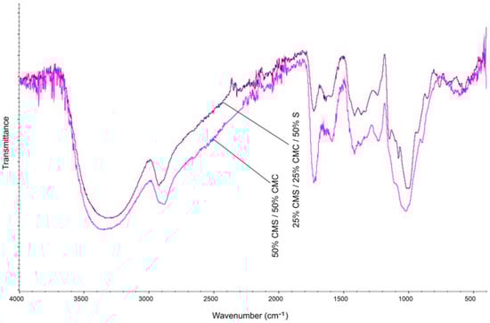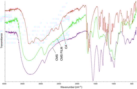 The FTIR spectra of the obtained CA, CMS, CMS-based film, and CMS/CMC/S film are presented in Figure 10 and Figure 11. The films were washed before analysis to remove residual CA and dried. The C-O band at ca. 1700 cm−1 corresponds to the protonated carboxylic groups of CA [51]. -COO- in unmodified CMS gives a strong band at ca. 1600 cm−1, where the intensity of this band corresponds to a high DS value [52].