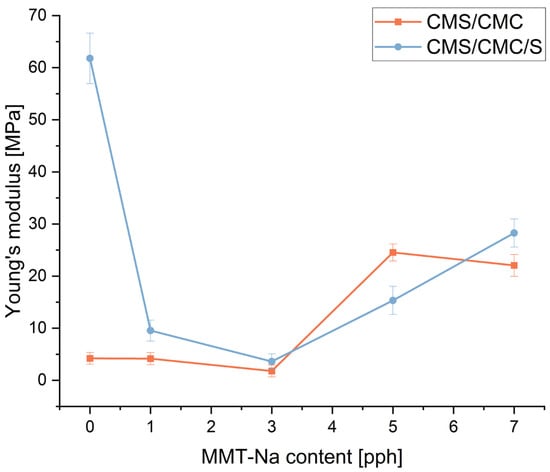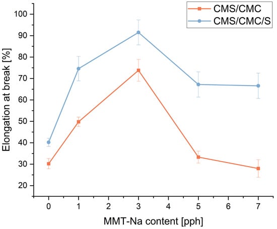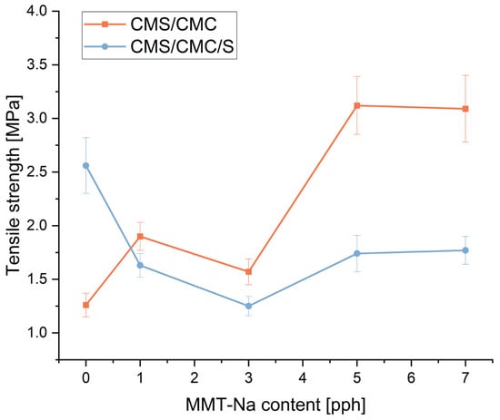 The addition of MMT-Na significantly affects the mechanical performance of the films. Elongation at break increased rapidly after the addition of 1 pph of the filler (three-component film) and 3 pph (two-component film), and then decreased to the starting level (pure sample). Tensile strength and Young’s modulus change differently for both types of films, but the observed trend is similar. With increasing filler concentrations, these values first decrease and then increase gradually. Only the ranges are different. This trend can be caused by two phenomena. The increase in elongation at break and decrease in tensile strength and Young’s modulus for composites with the filler content up to 3 pph can be caused by a restricted crosslinking reaction between CA and polymers, resulting from the presence of clay. Unreacted CA acts as a plasticizer. Similar results were reported by Zdanowicz and Johansson for starch-based films modified with choline citrate and MMT addition [53]. A higher concentration of the filler in the matrix leads to more H-bonds, and a more “dense” structure, overcoming the crosslinking hindrance. CMC/CMC/S films turned out to be more elastic but less durable. CMC/CMS films are more durable with an increase in the filler concentration but more rigid.