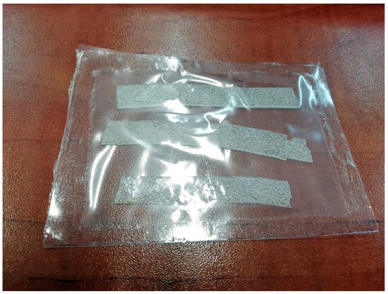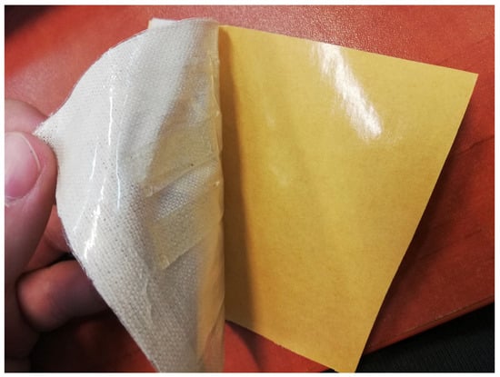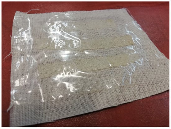 The system CMS/CMC/MMT-Na was selected for wound dressing model preparation. The biocomposite film was dried in a desiccator and then sealed in a foil bag. One side of this bag was permeable (perforated) (Figure 16). Then, the bag was covered with fabric on the impermeable side to create a protective layer for the patch and, at the same time, allow it to easily stick to the edges of the wound Figure 17. The whole dressing was protected with adhesive paper (Figure 18).