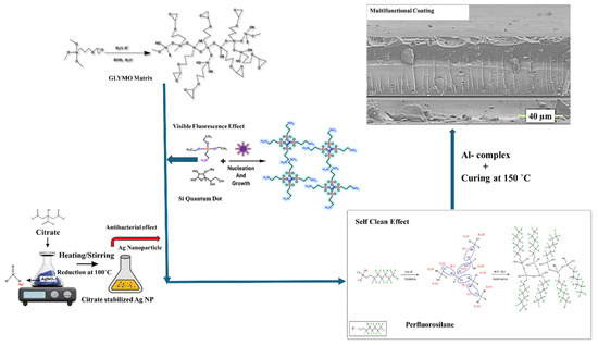 For this study, an inorganic–organic hybrid structure was selected as the matrix component during the synthesis of the multifunctional coating procedure. All the smart items of multifunctionality were introduced stepwise, like Si QDs, then prehydrolised fluorosilane compound, and finally, Ag NPs were introduced. In general, alkyltrialkoxysilanes (R-(Si-OR′)3, where R = alkyl mercapto, alkyl glycidyl, long alkyl, or acryl, and R′ = alkoxy groups) are promising precursors for coating materials during the synthesis of modified surface coatings, and therefore the chemical and dimensional features of this sol-gel reaction were taken as the template procedure [29,30,31]. There are many advantages of using this matrix since (i) its beginning reactions contain the semi-hydrolysed alkoxide precursor and allow the formation of –OH groups; (ii) epoxy branched alkoxide reactions form the connected and possibly elongated clusters, which is proper for the molecular control; and (iii) the epoxysilane precursor curing procedure is well known, compatible functionalities may be appropriately added, and final curing can be performed (Figure 3).