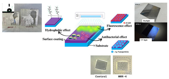 (a) Blank coating; (b) Si QD-embedded viable emitting coating; (c) Si QD- and Ag NP-introduced visible emitting and antibacterial coating; (d) Si QD- and Ag NP-introduced, and FAS-modified visible light emitting, antibacterial, and hydrophobic self-cleaning multifunctional coating.