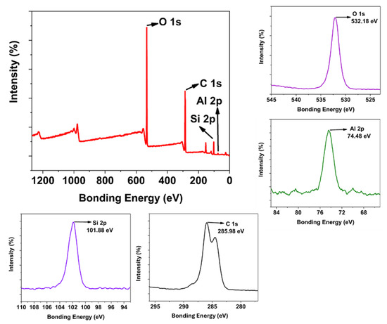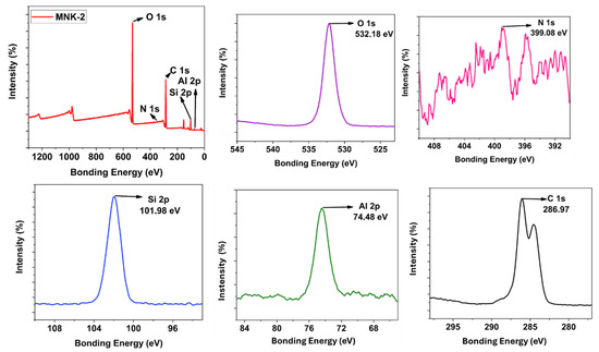 Figure 5 represents the hybrid coating modified with Si QDs, which selectively provides the visible region emission with the help of these Si QDs. When analysed, the MNK-2 nanocomposite shows clear survey peaks for Al, O, Si, and C atoms. Additionally, when the HR XPS peaks for this coating are examined in detail, a single peak at 74.48 eV for Al and another at 101.98 eV for Si atoms are observed. This indicates that the Si QD structure is primarily embedded in the nanocomposite body rather than positioned closer to the surface. It is understandable that otherwise, a different Si HR XPS peak could have been observed for Si QD in the HR XPS.