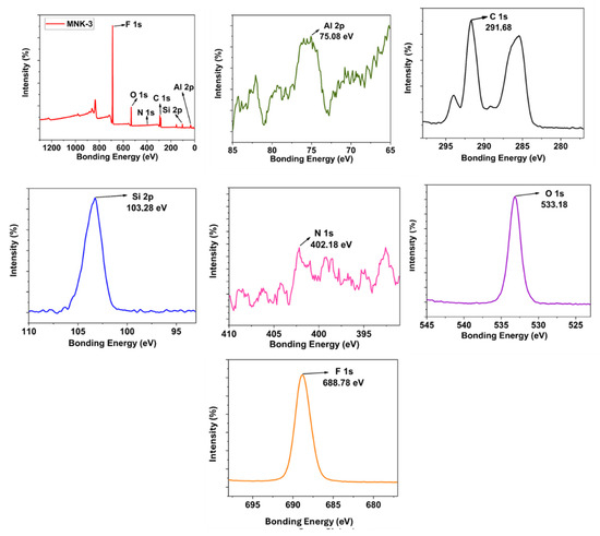 The same observation can be speculated for the N atom peak of the Si QD starting material AMEO (amino propyl triethoxysilane). Although certain of its presence, the N peak is observed as a low-intensity and broad peak in the 399–396 eV range. Although the high-resolution XPS (HR XPS) peak for the oxygen atom is observed as a single peak at 532.18 eV, a triple peak with different intensities indicates the expected diversity for the carbon atom. Thus, the atomic analysis of the embedded hybrid coating with Si QD is consistent with the formulation. When this coating (MNK-2) is compared with both Si QD and the FAS-modified coating (MNK-3), a prominent F peak is noticeable in the survey XPS for MNK-3 (Figure 7). This peak, observed at 688.68 eV, confirms that the FAS structure is homogeneously distributed on the surface due to the hydrophobic effects. As expected, the N atom peak from Si QD is again observed as a broad and low-intensity peak in the 402–394 eV range. Interestingly, the HR XPS peak is detected at a very low intensity for the Al atom at 75.08 eV when compared to MNK-2. The FAS modification significantly modifies the XPS peaks of Al atoms in the corresponding MNK-3 coating. When the Si HR XPS peak in MNK-3 is examined, a secondary peak around 104 eV is observed in addition to the expected central Si peak (103.28 eV). This is likely due to a shift originating from the Si atom in the FAS molecule. The Oxygen HR XPS peak in MNK-3 shifts to 533.18 eV and is again observed as a single peak. For carbon atoms, approximately five different carbon deconvolutions are observed, originating from different carbon characters in the main polymer structure and perfluor groups. Peaks for carbon atoms based on perfluorosilane are observed in the 291–294 eV range. Thus, it has been demonstrated that the basic FAS modification causes shifts in electron density and peak positions in all aluminium, nitrogen, oxygen, carbon, and silicon atoms.
