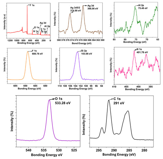 Additionally, the modification is evident in the fluorine peak, indicating a hydrophobic character. As a final multifunctional coating (MNK-4), when the XPS and HR XPS analysis of the Ag nanoparticle, FAS, and Si QD-modified nanocomposite is examined (Figure 8), the most significant difference was observed to belong to the Ag nanoparticles. The 3d 5/2 and 3d 3/2 peaks belonging to Ag nanoparticles are observed sequentially at 374.88 eV and 368.98 eV, respectively. Literature analysis shows that Ag nanoparticles exhibit 3d peaks close to these values. This has been added as the final functionality providing antibacterial properties after Si QD and FAS molecule modification, resulting in a multifunctional hybrid coating [38]. All other HR-XPS peaks for MNK-4 are similar to those of MNK-3. All existing atomic structures exhibit the same characteristic peaks as MNK-2, consisting of C, O, Si, Al, F, or N. This indicates that the coating with added Ag nanoparticles is consistent with the expected XPS analysis. Thermal analysis showed a total 52% weight loss in three steps, and XRD diffraction resulted in 2Q 19.08 degrees, which shows a noticeable shift when compared to MNK-1, MNK-2, and MNK-3. The FT-IR spectrum shows similar peaks to the MNK-3; no observable peaks for Ag nanoparticles were observed. The water contact angle shows 119°, proving the continuation of the self-cleaning feature of the multifunctional hybrid coating (Figure S6). While the current study did not include a full life-cycle or ecotoxicological analysis of the materials obtained and used, used Ag NPs were selected in our study due to their well-documented and effective antibacterial properties, which allow for lower required dosages compared to other biocides. In our synthesis, the amount of Ag NPs used was minimal (1 wt% of the final material), and efforts were made to immobilise them within the matrix, reducing the risk of leaching and environmental release.