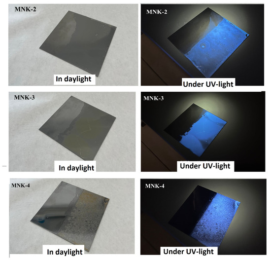 Si QD-supported fluorescence properties of the MNK-2, MNK-3, and MNK-4 multifunctional coatings are shown in Figure 11. Since Si QD embedding distinctively leads to the fluorescence features, all the coatings emit cyan-blue fluorescence. It is widely known that nanocomposite hybrid coatings, or materials that combine fluorescence and biocompatibility, may have huge roles in biological systems. Quantum dots provide exciting opportunities, such as biological imaging, sensing, drug delivery, and a visible light-emitting platform for biological systems [47,48,49]. Since tunability in the emission wavelength of quantum dot embedded systems enables real-time monitoring, targeted therapy is possible. Also, fingerprint detection with fluorescent coatings or materials has become widely known in daily life. As a part of multifunctional material, fluorescence emission features have a promising future for theranostic, biological, and material applications. Since Si QDs are very resistant to pH changes and their emission feature is strongly resistant and stable against environmental factors, one may apply these multifunctional materials on different surfaces such as ceramic, glass, metal, or wood substrates. As also shown, the emission properties of the coating were not affected by the step-by-step construction of the multifunctional material. Since cytotoxicity results are acceptable, multifunctional materials have massive potential for future applications [50,51,52]. The methodology employed in this study deliberately utilised widely available and low-cost precursors like APTES, AgNO3, solvents, GLYMO, Al alkoxides, and FAS in mild conditions, avoiding expensive or hazardous ligands (e.g., trioctylphosphine) and rare metals like cadmium. This makes the process inherently cost-effective when compared to traditional high-temperature or toxic precursor-based material synthesis. Furthermore, the water-based or alcohol-based solvent systems and ambient pressure processing enable facile scale-up with minimal energy demands, which further supports economic sustainability. Developing multifunctional smart materials exhibiting different features is expectedly promised to present significant challenges due to available chemical and physical incompatibilities among these properties. For instance, in this study, the effectiveness of antibacterial metal ions often increases in hydrophilic environments, whereas hydrophobic surfaces may reduce their efficacy. Similarly, fluorescent agents may degrade under exposure to light and oxygen, compromising long-term stability. These interactions complicate the formulation process and the overall performance of the final material. Also, such complex systems typically involve multi-step procedures and tightly controlled conditions, making scalability and cost-efficiency difficult to achieve very easily. Therefore, successfully implementing multifunctional smart materials that provide multifunctionality features for new applications requires simultaneous optimisation of structural compatibility, environmental safety, production feasibility, and economic viability.