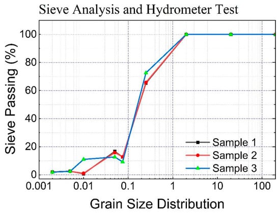 To essentially determine the soil classification, the China Code (GB 50021-2001) was used, and three samples of silty sand were sieved to determine the passing weight of each sieve from the highest to the lowest size, as basically recorded (refer to Figure 2). The samples noted as 1 and 2 are closely correlated. This means that the results obtained are closely similar to those of the samples in series 3. The results are clearly greater than those of the last two test results, even if there is no large difference between them. In general, the average number of samples passing through sieves of 0.25 mm to 0.075 mm, particularly the average, is 67.9%, and the number of samples retained in the hydrometer test from 0.075 mm to 0.005, which actually has an average of 11.56% from 0.005 to 0.002, is 2.53% below 0.002, with an average of 2.0%, which refers to silty sand among the soil classifications in China, and Table 1 illustrate the physical properties of silty sand.