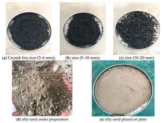 Crumb rubber tire (CRT) particle sizes of 3–6, 5–10 and 10–20 mm and silty sand to be mixed together.