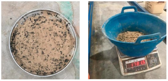 The silty sand and crumb rubber were first collected and kept in a controlled environment to prepare the test samples. Each size group was chosen at random. After that, three distinct weight ratios of rubber to silty sand were combined: 3%, 6%, and 9% of the silty sand’s dry weight. Overall, nine distinct combinations were generated. To guarantee uniform distribution and prevent segregation, the mixing procedure was carried out by hand. The mixtures were prepared for laboratory testing and maintained appropriately after homogeneity was confirmed. Table 4 and Table 5 provide specifics about the mix proportions and particle size distributions, whereas Figure 4 depicts the material’s appearance and preparation procedure.