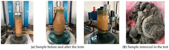 - The name was set, and pressure was applied to the sample via the proper triaxial test procedure. When the pressure exceeded 100 kPa, valves 1 and 4 were opened to release the air pressure and waited until the applied pressure was reached. The axial force on the sample was applied, the shearing stage started, and the test continued until the sample reached failure [,,]. Figure 6 show the sample processed after and before the triaxial test.
