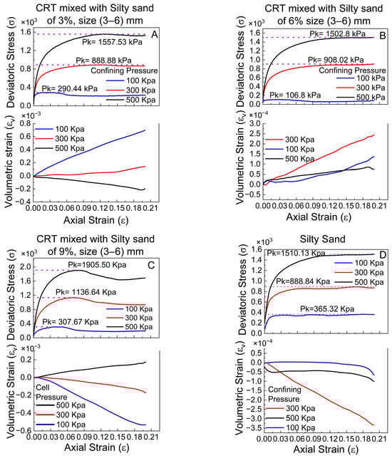 The graphs in Figure 7 present the results of unconsolidated–undrained triaxial compression tests on silty sand and CRT mixed with silty sand, with varying percentages of crumb tires (3%, 6%, and 9%) in the size range of 3–6 mm under different confining pressures (100 kPa, 300 kPa, and 500 kPa). The upper portion of each figure displays the deviatoric stress (σ) versus axial strain (ε), whereas the lower portion shows the volumetric strain (εv) against axial strain (ε). The three graphs show an increasing trend in peak deviatoric stress (Pk) as the crumb tire content increases, which suggests that higher reinforcement levels enhance the resistance of the material to deformation.