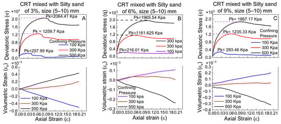 Deviatoric and volumetric stress results at confining pressure of 100, 300 and 500 kPa of CRT mixed with silty sand sizes of 5–10 mm at 3%, 6%, and 9% ratios.