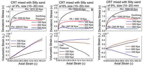 Deviatoric and volumetric stress results at confining pressure of 100, 300 and 500 kPa of CRT mixed with silty sand sizes of 10–20 mm at 3%, 6%, and 9% ratios.