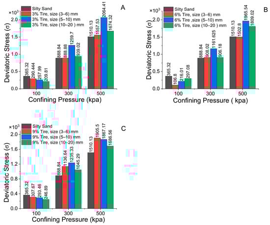 The shear stress analysis was performed on the following mixtures at ratios of 3%, 6%, and 9%: silty sand and CRT mixed with silty sand with (5–10) mm sizes, concerning the unconsolidated–undrained UU triaxial tests. The CRT mixed with silty sand (5–10 mm) with a 3% ratio resulted in the highest deviatoric stress among the samples under study (Table 10 and Figure 14A).
